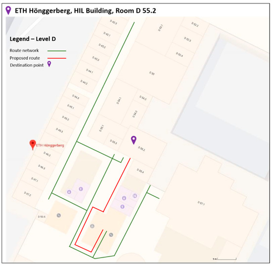 Since the experiment was a real-world case study, limitations related to the indoor environment emerged. All the experiments took place within a period of time of one month. At that time, in the testing area (E and D floors in the HIL building, Campus Hönggerberg, ETH Zürich), the exhibition of postgraduate theses of architectural students took place. This fact, on one hand, limited the available space within the routing path, but on the other hand did not cause further problems to the participants during the wayfinding task. In addition, the time during the day the experiments took place was important, especially with regard to the total time that participants needed to complete the wayfinding task. All experiments were conducted from 10am to 6pm. Depending on the exact time during the day each experiment took place, the number of people interacting within the test area was quite different. This fact may have affected participants’ navigation performance.