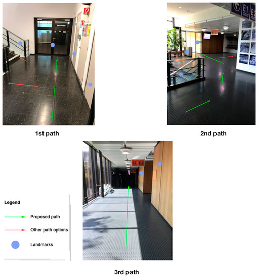 Traditional static maps have been employed for many years as navigational assistance [2]. Nonetheless, indoor navigation aids nowadays, mainly rely on location-based services (LBS) [3,4,5]. In these approaches, aside from the major challenge of accurate positioning the user, communicating effectively the routing instructions is of great significance as well [6]. So far, several approaches have been proposed, informing the user about the optimal routing decision, facilitating in this manner the wayfinding procedure. Among these techniques, non-map-based approaches are gaining interest, mainly because they offer to the user the possibility of not missing important elements of the surrounding environment. Although indoor navigational assistance based on non-map-based approaches has gained popularity, studies have shown that the typical map-based approach is still the most efficient navigational aid for indoor environments [7,8]. Landmarks can play a significant role in human orientation and wayfinding. In fact, there are examples in literature [9] supporting that the enrichment of navigational assistance aids with landmarks can essentially improve navigation performance and user experience. In Duckham et al. [10] a category-based method for generating routing instructions based on landmarks was introduced. Although this approach aims on outdoor navigation, Fellner and her colleagues based their work on it and expanded it by developing an algorithm, the indoor landmark navigation Model, for an indoor navigation scenario [11].
