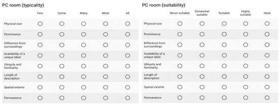 - Research on formulating general guidelines for describing landmarks, based on the type of the building: One of the main limitations of the ILNM is the need of a group of experts to evaluate the suitability of the indoor spatial feature categories that may serve as landmarks. On the basis that there are similarities among the indoor spatial objects that exist in buildings of the same type (e.g., hospitals, universities), research on formulating general guidelines for objectively assessing these indoor spatial features, based on the type of the building in which they lie, will be beneficial for the further expansion of the algorithm. In that context, the need of candidate landmarks’ assessment by a group of experts, will no longer be necessary.