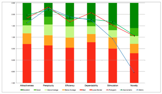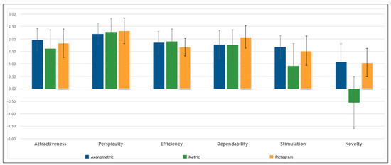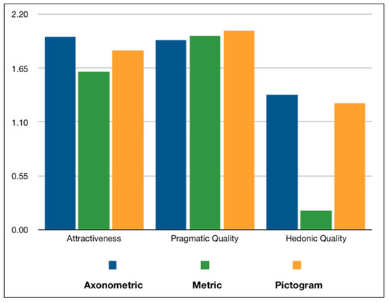 In a further statistical analysis, a Kruskal–Wallis H test was utilized, in order to examine the existence of statistically significant differences in the six user experience categories, among the three different conditions (pictogram, axonometric, metric). In the table below (Table 9) the results are presented.