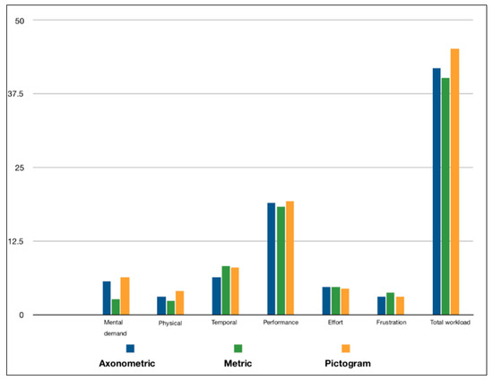Based on the figure above (Figure 23), there was no clear difference among the three approaches (axonometric, metric, and pictogram) in any of the six cognitive workload categories. For that reason, in order to analyze in depth and in pairwise conditions possible statistically significant differences, a Mann–Whitney U test was utilized. Below in Table 10, all the results are presented.