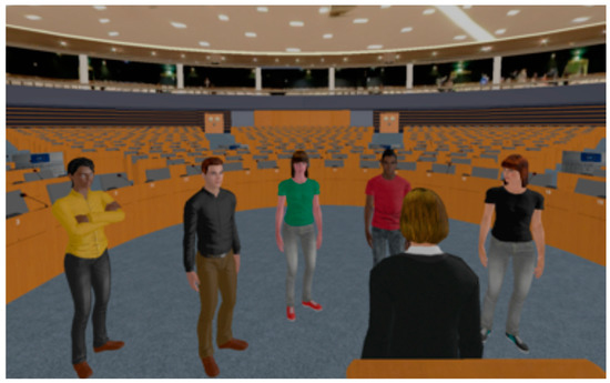 6]. The ECA follows a narrative (e.g., with information about points of interest in the parliament) defined in its script. After the completion of the tour, students participate in an online debate on the topic of multiculturalism moderated by the teacher. The ECA does not have an active role in the debate. However, it keeps monitoring the users’ activity, and interferes when needed (e.g., to call for attention when a student does not engage). The ECA is a female character capable of recognising the user’s speech (yes/no keywords) and affect and to react accordingly using verbal and nonverbal immediacy behaviours.
