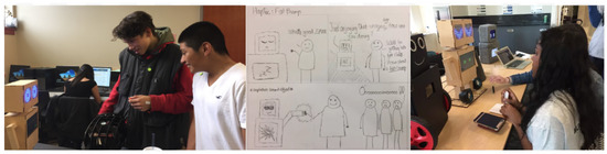 To further understand appropriate behaviors of a social robot for teens, we asked pairs of teens to storyboard a scenario in which a robot is interacting with a student in their school. In user experience design, professionals use a variety of visual tools and techniques for storytelling [74] including sketching and using storyboards [75] and comics [76]. These techniques are ways to envision and communicate designs and ideas for a broader audience. After participants completed their drawings, they were asked to articulate to the larger group what the robot was doing and why. This exercise was designed to invite teens to consider the specific context and constraints of their own schools and how an imagined robot might exist in this specific environment. By making it a collaborative method, we increased engagement by adding a social component. In addition, the collaboration allowed for interesting discussion during design, and thereby rich qualitative data. For example, during storyboarding, teens often discussed the roles of their robots, the acceptable robot behaviors, as well as ways in which they felt the robots could be helpful to teens. Some teens even began the process of problem-solving real world barriers, such as how the robot could navigate crowded hallways and manage communication during group interactions. During storyboarding, all conversations among pairs were captured as data in addition to the storyboard data itself.