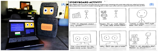 (A) EMAR version 4 with customizable face capability; and (B) teen-robot interaction storyboard.