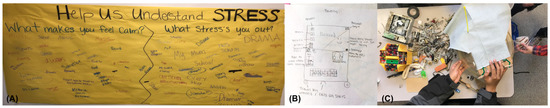 Examples of the stress board (A); sketching (B); and prototyping (C) from the design challenge.