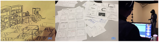 Stages of the virtual reality project: (A) sketching; (B) storyboarding; and (C) asymmetric gameplay.