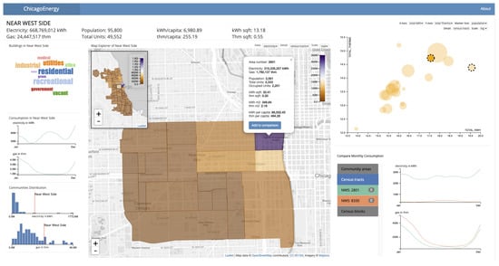 This project builds on the open-access Chicago Energy Usage dataset, the result of a collaborative effort between the City of Chicago, the Civic Consulting Alliance, Datascope Analytics and IDEO, with support from Accenture, Elevate Energy, the Citizens Utility Board, ComEd and People’s Gas [17]. This publicly accessible dataset contains information for 88% of the buildings of Chicago; a 68% of the overall electricity consumption and 81% of gas consumption; no data is provided for those buildings whose energy was not supplied by the earlier listed companies. As with all the urban energy visualization systems surveyed earlier, the portal dataset is a pre-recorded dataset, not real-time data; this aspect is due to the lengthy and difficult process of data collection and transfer from the energy companies to the city management.