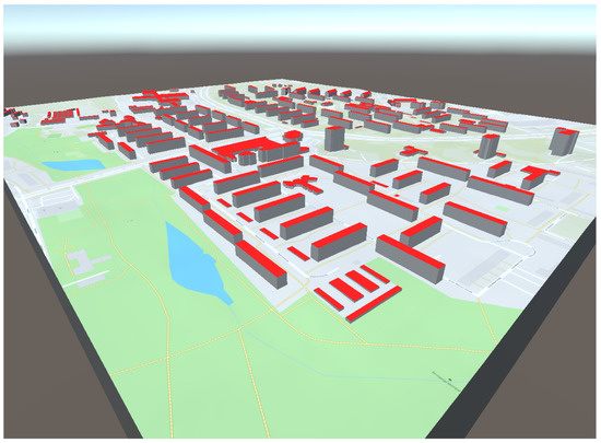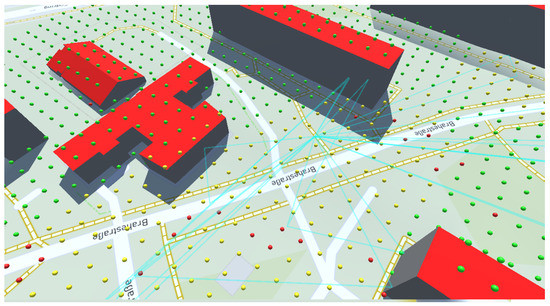 As expected, there were large differences in how long the precalculation takes. With the area of CityGML data used here (see Figure 5 for an overview), the startup time could be reduced to about 20 s by precomputing the grid of observer points and simply loading it at startup. Subtracting those 20 s from the startup time results in Table 1, thus also telling us how long the noise simulation for the observer grid takes in each configuration. For example, in the case of ten source points and with mobile hardware, one observer point takes roughly 150 ms to compute. This calculation has to be performed for each user movement, which means it simultaneously represents a delay in teleportation. For ten source points, this barely makes a difference, but achieving the density found in classical noise maps is currently not feasible. Some noise propagation calculations require dozens of these points for every road segment—our prototype currently cannot handle this for more than one short street.