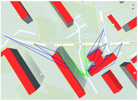 Considering that the large majority of urban buildings have a very simple shape in LoD2 data and are made out of some form of concrete or steel, we were able to implement a heuristic approach that manages to construct all four types of paths in most cases. A rendering of a common propagation situation is depicted in Figure 3. For performance reasons, we only allowed specular, first-order reflections. The way we achieve this is by casting a ray from observer to source. If the ray hits an obstacle, we fire three new rays, the target of each shifted one meter left, right, or up from the obstacle impact point. If they miss the obstacle at that point, we have a diffraction and can retry the raycast from there. If they still hit the obstacle, we shift them further in their direction. This only assumes that the user is not surrounded by geometry on all sides (to handle that case, we limit the number of steps in each direction) and usually constructs two vertical and one horizontal diffraction if no direct path is present. (We could then make another assumption about building shape and construct a simple rectangle of paths to fill out the spaces between the three that we have, though this is not currently included.) Reflections are handled by raycasting in every direction (at one degree steps) on a plane between source and observer (this is where we utilize the 2D nature of the standard—full 3D reflections would increase the complexity drastically). At the impact point, we tested whether the direction of the target and the impact angle would end up describing a specular reflection. We allowed some room for error in this test, so we do not miss too many reflections, which would have happened between two angle steps.