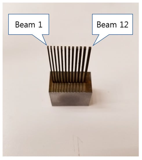 In order for the proposed device to be usable for image perception, individual beam vibration must be perceivable by a user contacting the beams with the skin. The first requirement for perceivability is that the beams must continue to vibrate, while in contact with the skin. To investigate human perceivability and determine whether beams continue to vibrate under skin contact, human skin contact experiments are conducted on a small prototype device. For this experiment, a beam array prototype having a total of 12 cantilever metal beams is selected, as shown in Figure 2. The beam array is designed to have less than 1200 Hz as the resonant frequency range for all metal beams. Every beam has the same length, 29.6 mm, so that the skin of a finger can easily contact all beam tips simultaneously. The beam array is manufactured by wire EDM at Arizona State University. Beam number 1 represents the leftmost beam, and beam number 12 represents the rightmost beam.