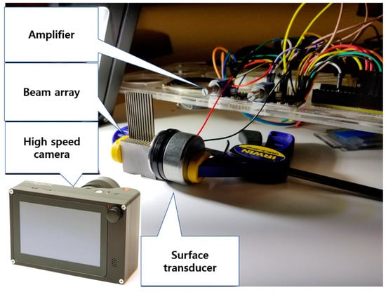 The input of the surface transducer is connected to the output of an amplifier by USB cable, which receives its input from a function generator. The amplifier is provided with a constant 5 V power source. The function generator is set to generate a sine wave of a specified ‘starting frequency’, which is determined by approximating the natural frequency of the beam from a lumped-mass model based on the actual beam dimensions. The amplitude dial of the amplifier is adjusted to a small enough amount that the 1st beam does not hit the 2nd beam when the 1st beam resonates. A high-speed camera is positioned so that the field of view is parallel to the axis of the metal beams to record the beam vibration at the moment a finger touches the beam tips. The high-speed camera is fit with a microscope lens and positioned so that two or three beams are focused in the high-speed camera view simultaneously. A frame rate of 8819 frames per second is used for video recording to capture changes in beam vibrations when a finger touches the metal beams. Figure 3 shows the experimental setup with a high-speed camera. First, a dried finger presses the beam tips with various forces to see if there is a moment when the beam does not stop.