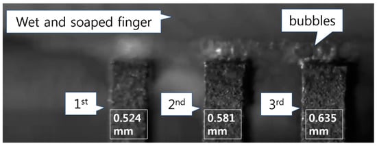 In the observation of the recorded files with eye, it is still found that when the finger that is wet or wet and soaped touches the beam tip, the amplitude of the vibrating beam decreases, and the beam stops vibrating. After the skin contacts the beam tips, the beam stops vibrating within about 6–10 milliseconds. Figure 5 illustrates the moment when a wet and soaped finger touches beam tips. The three rectangular part is the first three thinnest metal beams, and a white object with bubbles above the three beams is the wet and soaped finger.