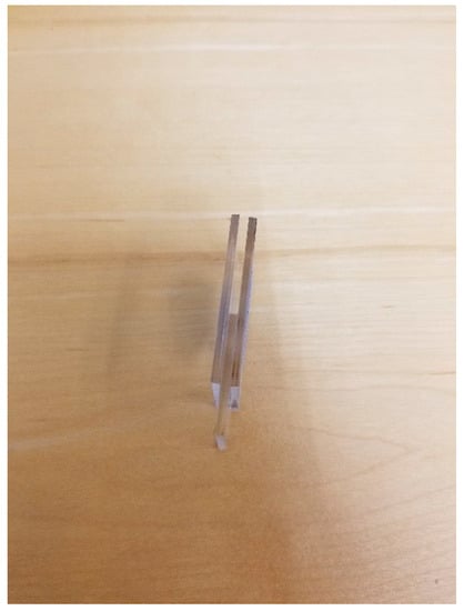 A and B of ‘Dragon Skin 10 very fast’ are mixed and solidified. The solidified dragon skin is cut to make rectangular shaped silicone rubber beams. Two silicone rubber beams are attached to the tips of two beams of the metal prototype with an ethyl cyanoacrylate adhesive. The length of silicone rubber beams is 11.7 mm, and their thicknesses, around 1.1mm, are slightly thicker than the thickness of a metal beam. Since the silicone rubber beams are cut manually, their thickness is not uniform, as shown in Figure 8. The same experimental setup as shown in Figure 3 is used to resonate the metal beams to which silicone rubber beams are attached, and a finger touches the silicone rubber beam tip when the beam vibrates in order to perceive the beam vibration. Only two metal beams with silicone rubber beams attached are resonated. After investigating the 2nd metal beam vibration with the long silicone rubber beams, the long silicone rubber beams are cut into the half to investigate the difference of the 2nd beam vibration.
