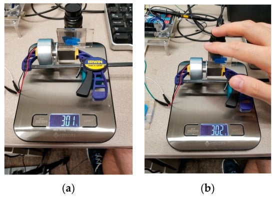 The image of finger force measurement using a scale: (a) Total weight of whole experimental device without a finger press; (b) Total weight of whole experimental device with a finger press.