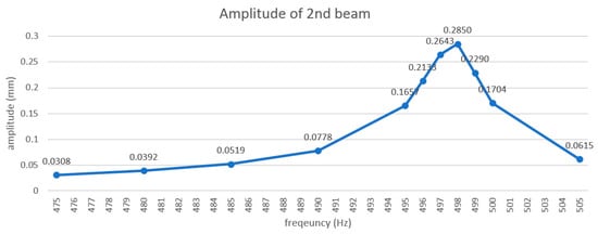 The recorded vibration response of the 2nd metal beam is analyzed by an optical flow algorithm implemented in Python. The vibration response of the 2nd beam is analyzed depending on the length change of the silicone rubber beams. For example, Figure 10 shows the amplitude of the 2nd metal beam depending on the forcing frequency provided by the surface transducer when the silicone rubber beam is 3.4mm long. It is shown that when the silicone rubber beam length is 3.4 mm, the 2nd beam’s resonant frequency is 498 Hz.