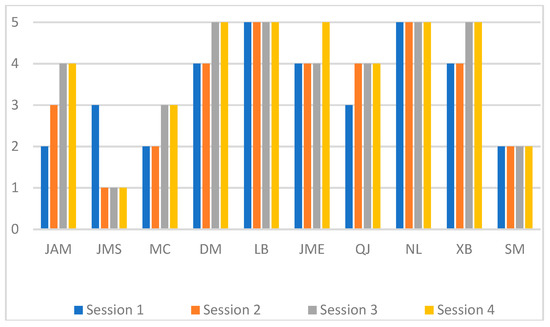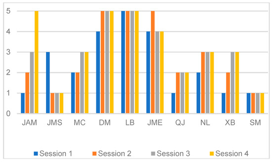 Indicators of degree of motivation (4–5: High; 3: Intermediate; 2–1: Low) for each session of each player.