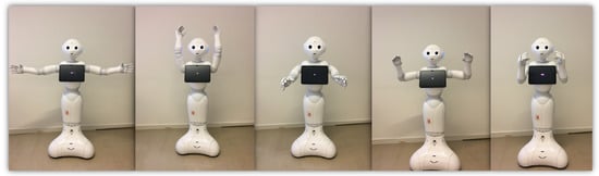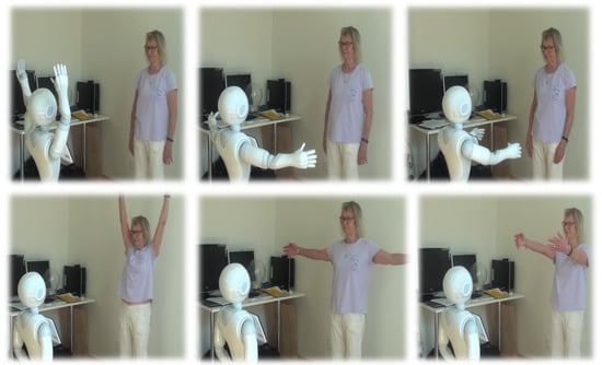 - Guneysu, A.; Arnrich, B. Socially assistive child-robot interaction in physical exercise coaching. In Proceedings of the 26th IEEE International Symposium on Robot and Human Interactive Communication (RO-MAN), Lisbon, Portugal, 28 August–1 September 2017; pp. 670–675. [Google Scholar]