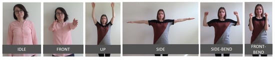 Performance of the Participants: We collected data from 25 persons; each person repeated each arm motion 5 times. We recorded a video of each repetition, and extracted images from these videos. These images constituted our dataset for arm exercise recognition. We used transfer learning for for exercise recognition by retraining the final layer of Google’s Inception-v3 model [], a deep convolutional architecture trained on the Imagenet dataset. The final layer of the Inception-v3 model was trained by using 80% of the data of all the subjects for training, 10% for validation and 10% for testing. We have 6 different arm motions: idle, arms-up, arms-side, arms-front, arms-front-bending, and arms-side-bending (see Figure 3).