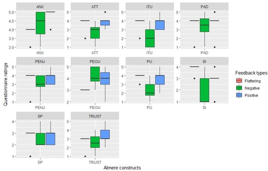 In summary, this research has established that older people evaluated the robot with flattering and positive feedback more positively. The attitude towards technology, intention to use, perceived usefulness, and social influence constructs were rated significantly higher in the flattering and positive feedback groups. Conversely, the perceived ease of use construct was rated significantly higher in the negative feedback group. There was no statistically significant difference for the other constructs of the robot acceptance. The box-plots of Almere constructs are given Figure 4.