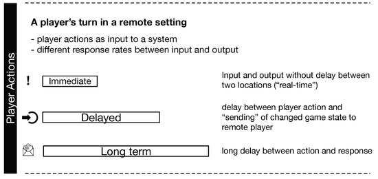 In a remote setting, the notion of shared and individual interactional spaces (e.g., individual player boards as described in Section 4.2) becomes a matter of potentially different timezones, spatial realities and interactional contexts. Based on this “asynchronicity”, players would, for instance, interact with a given game system under different contextual influences (e.g., lighting conditions, noise, etc.), as well as in different frequencies.