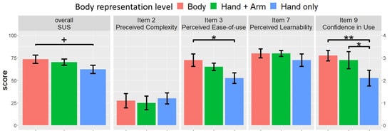 The overall SUS score is shown in Figure 4. A Bartlett’s test suggested that the assumption of homogeneity of variances was met (Bartlett’s K-squared = 0.999, ) and repeated measures one-way ANOVA was used to analyze the effect of body representation level on the overall SUS score; a marginal significance was noted (F(2, 18) = 3.472, p = 0.053, ). Furthermore, post-hoc tests involving the Bonferroni correction were conducted. The results indicate that the overall SUS score was marginally significantly higher in the “Body” condition (M = 73.5, SD = 14.72) than in the “Hand only” condition (M = 62.25, SD = 14.55) (t = 2.56, p = 0.059). The “Hand + Arm” condition (M = 70.25, SD = 10.77) had no significant difference from the other two conditions.