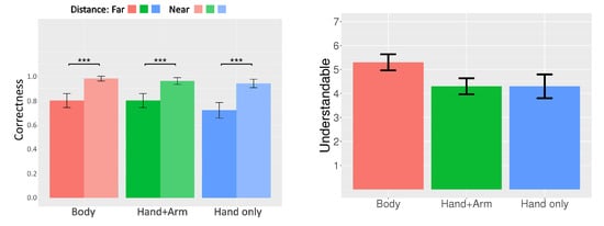 As described in Section 3.6, the task completion time has been widely used to assess the efficiency of systems [,,,,,]. In this work, as we used prerecorded instructions, the task completion time was fixed. Thus, in the experiment, we considered the ease of tracking an avatar and time to respond to the avatar’s instruction as the two indicators associated with the efficiency.