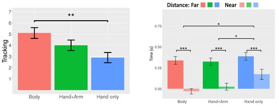 (Left) Result of Q2 (Tracking); and (right) result of time difference. All error bars represent standard errors.