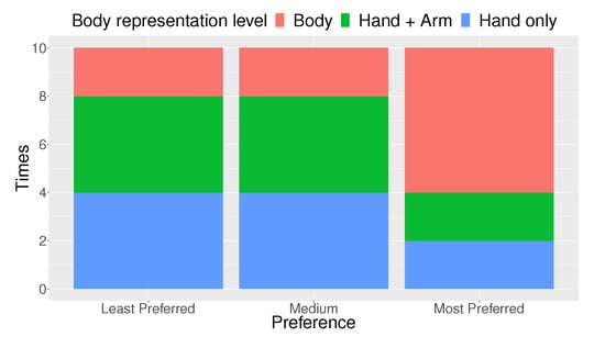 A non-parametric Friedman test was conducted to analyze the ranked data of preference of avatars with three body representation levels. No significant difference between the avatars was noted ((2) = 2.4, p = 0.301) (Figure 8).