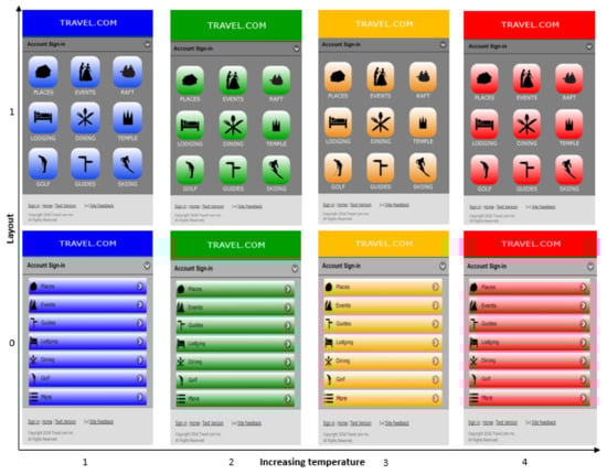 - Coursaris, C.K.; Swierenga, S.J.; Watrall, E. An empirical investigation of color temperature and gender effects on web aesthetics. J. Usability Stud. 2008, 3, 103–117. [Google Scholar]