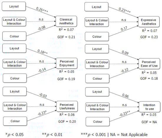Figure 3 shows the path model for each of the TAM constructs. The models are characterized by three parameters: coefficient of determination (R2), goodness of fit (GOF) and path coefficient (β) []. The R2 value indicates the amount of variance of the target TAM construct explained by either of colour temperature and layout exogenous constructs or both combined. The GOF values indicates how well each model fits its data. Finally, the β value shows the strength of the relationship between each of the predictors and the target construct. Overall, either of colour temperature and layout or both combined are able to predict 5 to 7% of the variance of each TAM construct, with a GOF value ranging from 18 to 23%. In particular, for the intention to use construct, there is no GOF value for the model given that only one item measured each of the constructs in the model. Moreover, our results show that layout positively influences classical aesthetics (β = 0.25, p < 0.001), expressive aesthetics (β = 0.23, p < 0.001) and perceived enjoyment (β = 0.18, p < 0.001). However, colour temperature negatively influences perceived usefulness (β = −0.23, p < 0.05) and intention to use (β = −0.23, p < 0.001). Our multigroup analysis shows that there is no significant difference (p > 0.05) between males and females with respect to all of the relationships. Finally, as shown in Figure 3, there is no interaction effect between colour temperature and layout on the target TAM construct in each of the models.