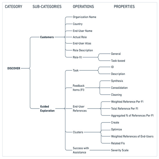 The discover category (depth_1—Figure 2) is composed of two sub-categories as mentioned earlier. Those refer to “customers” and “guided exploration” classifications. A team should have a sufficient knowledge about the customers and end-users that participated in a particular usability study. An end-user represents a person that encapsulates the description and characteristics of a (business) role, or in more detail of a ‘persona’ as this has been defined by the team (a role might consist of more than one persona, depending on the viewpoints and specifics of a solution, e.g., the role of project manager might include the personas of project managers that are related to (a) an application for project planning generation and allocation of resources, and (b) to an application that monitors the execution of the project plan as well as the collaboration with the consultants). The “customers” sub-category receives as input the profiles of the end-users containing details like organization name, country, end-user name, actual role, end-user alias, and role description, and provides output related to end-users insights and the role-fit (may be general background check—across the business scenario and tasks, or task-based—measuring the degree of goodness of the role for a specific task). This allocation pre-supposes the verification of the initial (expected) end-user profile, prepared by the team before the end-users recruitment for the usability studies, with the profiles of each end-user collected during the execution of the session (actual). The team then measures to what extent there is a match among the two and where, generating a percentage e.g., 75% fit in tasks 1–3 and 100% fit in tasks 4–6. As soon as there is a clear understanding about the end-users that have participated in the study then the team can move on to the qualitative analysis by utilizing the “guided exploration” sub-category. This classification receives as input the raw data of the validation script notes collected during the usability study and through various iterative operations produce optimized and semantically enriched clusters containing feedback expressed with active wording for enhancing the clarity of a fact or event. Such operations include tasks identification and description, and allocation of the respective feedback items to each one of them after the synthesis, consolidation, and cleaning process of data. The end-users weighted references are assigned on each feedback item based on their fit in the respective tasks identified earlier, and specific aggregation calculations are applied obtaining e.g., the total references per feedback item by the end-users. Furthermore, the success with assistance for each end-user on a scale from 0–4 is recorded, indicating the degree of external influence (e.g., tips or hints by the moderator of the usability test) an end-user had for accomplishing a task.