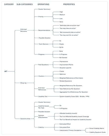 The act category (depth_3—Figure 4) entails three sub-categories, namely, “informed decisions”, “wrap-up”, and “solutions area”. The “informed decisions” sub-category receives the insightful recommendations generated from the “learn” classification and yields possible high-level solutions and actions for the identified usability issues. The main operations that drive a team’s decisions regarding the actions to be taken for each feedback item include the task_id, cluster summary, priority, and recommendation discussed earlier as well as possible solutions (discussion points and alternative suggestions that could be applied for tackling one or more usability issues), team decision (with properties like ‘go’, ‘maybe’ or ‘no go’ for a solution), and progress identification (as ‘done’, ‘in progress’ or ‘not started’). The “wrap-up” classification handles all the information and analysis that takes place usually after the usability study’s main tasks execution and includes operations like the analysis of post-questions (referring to impressions, improvement points or situation-specific comments), clustering of these feedback items (including optimization, allocation of weighted references of end-users and association with the related questions), weighted end-users’ references per question and aggregation, and usability or UX test tools’ responses (data collected by the use of any standardized supportive usability tool/questionnaire, mainly for cross-evaluation of the main tasks, like e.g., SUS [38] or UEQ [66]). The “solutions area” sub-category enables a deep dive into the alternative approaches for solving the discovered usability issues. The team has the chance to synergistically work towards detailing e.g., high priority usability issues, that have been assigned with a ‘go’ and are ‘in progress’, for identifying viable solutions. This sub-category contains operations like task_id, cluster summary, usability issues per task (with properties ‘go’ and ‘in progress’), possible solutions (a list of alternative approaches discussed by the team for solving the usability issues), solutions effectiveness (indicating which usability issues are influenced (tackled) by which solutions and to what extent they are solved, e.g., one might be solved by 25% or another by 75% by one solution (i.e., partially to fully solved), and also the coverage a solution has across the usability issues, e.g., solves four of them (fully or partially) with a beneficial impact of 45%, once its total contribution is calculated). Lastly, an important operation is the viability which is realized through properties like estimated effort (how much time is needed for a specific solution to be implemented based on existing resources, expertise, know-how, difficulty, etc.), calculated risk (issues that might arise during the process and might hinder or delay the expected implementation, e.g., lack of existing guidelines, external collaborations), and likelihood of timely completion (a reconfigurable smart viability matrix allocates a solution, based on the assigned effort and risk, to a viability quadrant scale (i.e., 1 = high to 4 = low) indicating how probable it is to be successful).