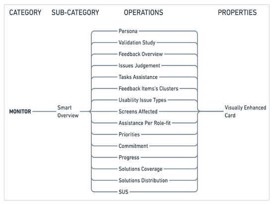 The monitor category (depth_4—see Figure 5) consists of the “smart overview” sub-category which facilitates the continuous monitoring and exploration of the information that has been extracted from the previous classifications. It generates visually enhanced digital cards based on operations like persona creation, validation study, feedback overview, issues judegment, tasks assistance, feedback items’ clusters, usability issue types, etc. Most of these operations receive input from the previous classifications and despite the presentation of a quick overview of the empirical research outcome, guides project teams to an informed drill-down on the reformulated semantic data (by applying e.g., filters) for prioritizing their actions and decisions. Furthermore, the visual appearance of data facilitates the quick transition from data analysis to documentation and fast reporting (e.g., by simply cropping and pasting the visual cards in perspective), a well-known time-consuming challenge in user research.