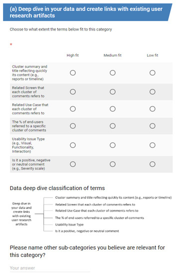 Among the various approaches (e.g., Delphi Card Sorting, Remote Card Sorting, Search Analysis—[37]), we decided to use the Closed Remote Card Sorting method, as it was best fitting to our purpose and research circumstances. We created an electronic environment composed of Web-forms (see Figure 6), each one outlining the different hierarchies of the EUREKATAX based on its four distinct categories described above. Participants could interact sequentially with the environment progressing from each classification to the next and providing their feedback. For each sub-category, operations, and properties we collected two types of participants’ assessments regarding the validity of each classification. At first, users had to respond to what extent a classification of items fits together in terms of relevance (1 = low, 2 = medium, 3 = high fit), and second, they could provide in a free text format their additional comments, wishes or alternative views for each category. Given that the validation followed the unmoderated protocol we wanted to ensure that the various items would be understandable by the users who share different experiences and backgrounds. In this respect, we decided to use more descriptive phrases in cases that the meaning of the classification items was not self-explanatory, e.g., we re-phrased the operation “task” expressing it as “information about the tasks, that the study ran upon”, or the sub-category “data empathy” described as “deep dive into your data and create links with existing user research artifacts”. This was an iterative process step during the preparation phase of our taxonomy for validation which lasted for two weeks in total including parallel pilot testing of the taxonomy’s semantics with targeted users, controlling this way the span of different roles and experiences. We ran the study remotely for two months (from 1 July 2018 until 1 September 2018), adhering to the ecological validity paradigm [67], and allowing the users to access the study on their preferred time and location, without also imposing any restrictions on the duration for providing an answer. To avoid any learnability effect during the process, each participant could execute only once the study which lasted approximately 15 min.
