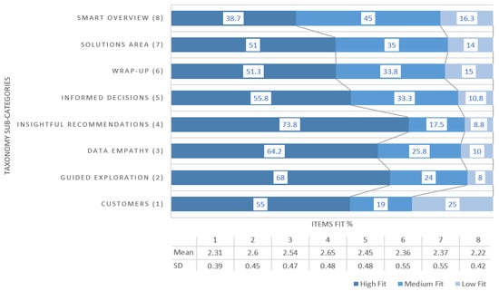 Descriptive statistics showed a strong tendency of participants towards the “high fit” preference of items in relation to the various classifications they belonged to (M = 2.44, SD = 0.40). More specifically, multiple response analysis revealed that 53.6% of the terms were “high fit” in the various subsequent classifications of the taxonomy, 32% “medium fit”, and 14.4% “low fit”. This result could be interpreted as a total of 85.6% of “high and medium fit” of terms in the various hierarchies leading to confirm also our second hypothesis (H2), since it showed a strong preference of the taxonomy’s items in their respective categories by the participants. Figure 7, depicts the distribution of fit across the various sub-categories of the taxonomy. Given that our data were not normally distributed the non-parametric Friedman repeated measures test was carried out to compare the total perceived fit for the various classifications; whether there was an equal distribution of the preferred fit on the items in the eight classifications of the taxonomy (H0). There was found to be a significant difference between the classifications, 2 (7) = 29.245, p = 0.000, i.e., significant variance on the preference of the experts regarding the fit of the terms, resulting in rejecting the H0. As we can observe, the two sub-categories that scored higher were the “insightful recommendations” and “guided exploration” with M = 2.65, SD = 0.48 and M = 2.6, SD = 0.45 respectively, while those that scored lower were the “customers” (M = 2.31, SD = 0.39) and “smart overview” (M = 2.22, 0.42).