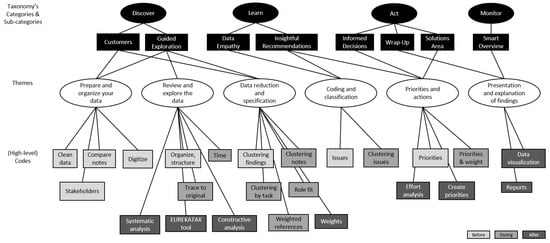 The first level of a taxonomy usually describes its main categories, as the higher level of abstraction of the predetermined organization of information. Moving a team, during the data analysis process, horizontally—across the four different conceptual depths of the purposeful categories, obtains a holistic understanding and knowledge of the qualitative data analysis process while at the same time acquires or improves various related skills like prioritization and formulation of action plans for analyzing certain types of feedback items. In EUREKATAX, the main goal-directed categories, namely discover, learn, monitor, and act, embody basic concepts (as interrelated layers), which define its object, inner structure, and boundaries, suggesting a methodological guidance and conceptions how one can proceed in order to grasp the object adequately [63], i.e., the exploration and transformation of feedback items into meaningful and insightful action items. The discover category (or layer) concerns the creation of an understanding about the end-users participated in the usability study and the data using synthesis, consolidation and clearing techniques of feedback items that in the end will produce possible clusters. This layer is composed of two different classifications of data referring to the customers and guided exploration sub-categories. The main purpose of the learn category is to assign meaning to the extracted feedback items (or clusters) by identifying a semantic viewpoint of them, their relationships with other entities (e.g., interaction designs or use cases), and evaluate their type (e.g., usability issue or just a comment), significance and impact on the system under examination. This category consists of the data empathy and insightful recommendations sub-categories. The act category refers to the decisions and actions that someone takes regarding the feedback items based on his so far analysis and accumulated knowledge, the proposed solutions and other contextual information like priorities, strategic directions, resource availability, effort, capacity, skills, etc. This category is composed of three sub-categories, the informed decisions, wrap-up, and solutions area. Finally, the monitor category facilitates the continuous tracking, smart data inspection over the analyzed and semantically enriched data through meaningful data visualizations, and quick reporting. It contains the smart overview sub-category.