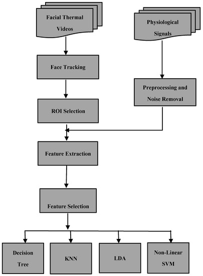 Facial thermal imaging is the main non-invasive method that many researchers utilize for the purpose of detecting emotional and stress reactions [16,24,31]. We used several machine learning techniques to increase the accuracy rate of this technology and to find the ROIs on the face that could be more effective indicators of deceptive anxiety. Figure 2 illustrates the overview of the study architecture that was developed and is presented in this paper