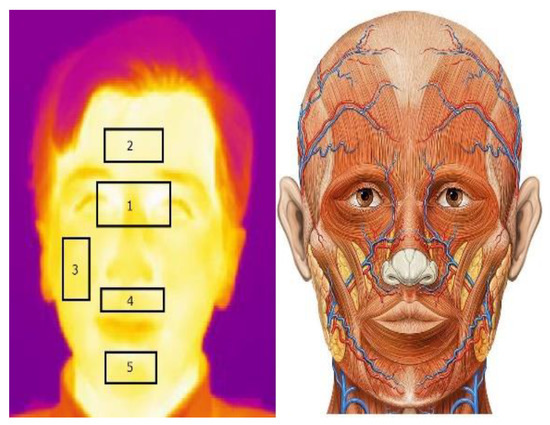 For converting thermal video to thermal time series, we extracted the maximum and minimum values in each frame of the video from the manually selected five ROIs on the face. According to anatomic knowledge, these areas are more influenced by psychophysiological changes because of the underlying vasculature network and skeletal muscle tissue. Furthermore, these thermal ROIs were utilized based on previous publications in this field, which suggested that these regions are most affected by psychophysiological states [18]. To summarize, we extracted five ROIs on the face and maximum and minimum temperature value of each region would represent every thermal video by ten signals. The illustration of these five regions on the face and the corresponding anatomic image are shown in Figure 3.