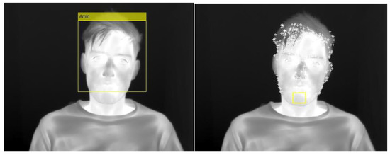 Although we asked the subjects not to move their head and body during the interview, some few natural movements are unavoidable which may impose negative effect on the classification results. In order to compensate for any unwanted head movements during the interview, we employed a thermal face tracker. The Viola–Jones object detection framework was applied on the facial thermal images for segmentation of the face from the background [35]. Then, we adopted the Kanade–Lucas–Tomasi (KLT) method for finding feature points on the face and tracked them continuously in a thermal video [36]. In this method, first, we found traceable corner points on the face by using Shi–Tomasi method [37] and then the detected points were tracked using KLT points’ tracker. Figure 4 shows this procedure in two steps: face detection and finding feature points.