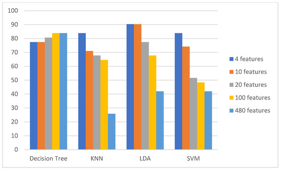 Visualizing the performance of ROC feature selection in our thermal “mock crime” dataset by three classification models. The vertical axis is the accuracy percentage result and the horizontal axis is the classifier model. The colors show the results with reduced number of features.