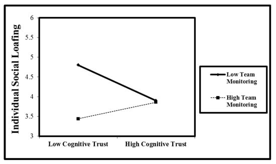 Team monitoring moderates the relationship between individual cognitive trust and individual social loafing in such a way that the strong negative relationship between individual cognitive trust and social loafing weakens when team monitoring is high.