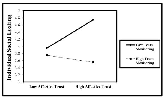Team monitoring moderates the relationship between individual affective trust and individual social loafing in such a way that the strong positive relationship between individual affective trust and social loafing weakens when team monitoring is high.
