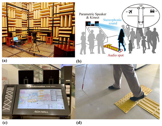 In Miyauchi’s study, a parametric speaker is used, and guidance can be performed on the opposite bank on a pedestrian crossing without braille blocks [19,20]. However, it is desirable to guide the visually impaired in multiple directions. Therefore, Aoki et al. showed that multidirectional presentation is possible by presenting stereophonic sound from parametric speakers [21].