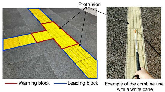 A white cane is widely used by people who are visually impaired for independent travel. Other than that, a braille block is used in some countries(Figure 2). Although it is easy to learn how to use these tools, they cannot provide textual data such as facility information. Tactile maps are used to compensate for this, but learning Braille is indispensable for using tactile maps. The acquisition rate of Braille is less than 10% among visually impaired people [3], and it is clear that many visually impaired persons cannot use it. For this reason, studies have been conducted to make tactile maps audible and provide information by voice [4,5,6]. However, it is necessary to search for the presence of a tactile map by fumbling, which is a burden for the visually impaired.