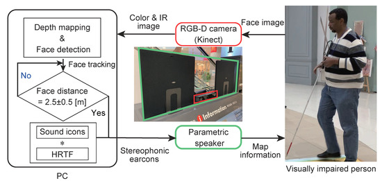 Block diagram of the proposed method: Face recognition is performed using images from an RGB-D camera. When a face approaches a certain distance, a stereophonic sound including map information is presented by a parametric speaker.