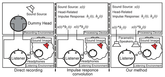 Humans perceive the sound direction from a sound source when it reaches the eardrum after it is reflected and diffracted on the floor, shoulder, head, pinna, etc. [31]. Physical characteristics including differences in the sound volume, time, and frequency from the sound source to the eardrum are called the head-related transfer function (HRTF). The HRTF mimics the shape of a human head, and is measured using a device called a dummy head with a microphone in the ear canal or by inserting a microphone into the human ear canal. By convolving the HRTFs of the right and left ears in time domain measured as shown in Figure 4 into an audio signal and then playing back the respective sounds in the left and right ears, the audio signal can be localized. However, because individual HRTFs are different, the use of a commercially available dummy head, voice recorded with another person’s head, or convolutional voice of the HRTF measured with the dummy head may lead to the user hearing the voice in a direction that deviates from the original audio signal direction. Therefore, Perrott et al. proposed the use of dynamic binaural signals in the presentation of stereo sound images [32]. The dynamic binaural signal is an audio signal that convolves the HRTF in time domain following the direction of the head of the listener. Dynamic binaural signals increase the information content of the sound image, making it easier to sense the direction. However, the dynamic binaural signal must be listened only using wearable sound devices (earphone and headphone), and it must be appropriately measured in front of the listener by attaching the sensor to the listener’s head. In this study, we implemented a recording method using a dummy head, in which a dynamic binaural signal can be received without using a headphone.