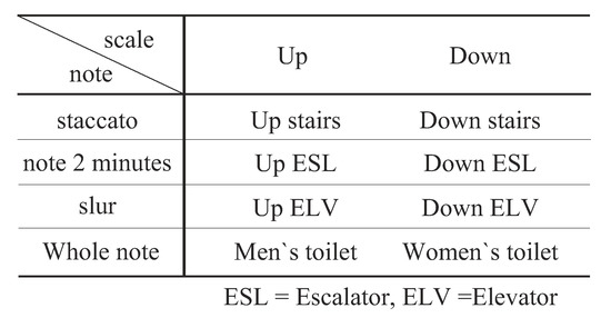 In addition, the design index of earcons is described. Earcons must be designed so as not to give an unpleasant feeling when listening. Roberts’s subjective experiments showed that, among the major, minor, diminished, and augmented chords, major chords were identified as the most harmonious sounds [37]. Therefore, all earcons in this work were created with melodies using major chords. The facilities that are audibly represented by the earcons in our work are often located in public spaces; more specifically, we focus on elevators, escalators, stairs, and toilets. Each earcon represents the facility using the difference in the tone color, and is designed based on the constraint that expresses the attribute of the facility by the changes in the tone, such as up and down. Objects that are related conceptually to the directions of up and down had earcons with the common feature of the melody going up and down on the scale(Figure 5). The musical scale of the men’s room is lowered by an octave, and that of the women’s room is raised by an octave. Figure 6 shows the score of the created earcons. As described in the next section, using the earcons designed based on the design index above, we verify that the proposed method can guide visually impaired and sighted people to the desired destination in a noisy environment.