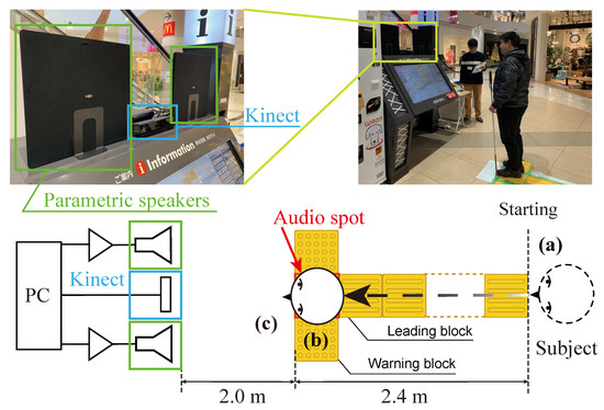 For the braille block, a leading block and a warning block of 0.3 m per side were used. Additionally, a parametric speaker (Holosonics AS-16B) was installed on the digital signage (Figure 7). When a subject reaches a branch point (warning block) on the braille block, a stereophonic acoustic signal including map information is transmitted.