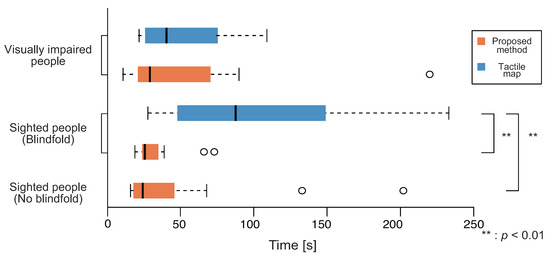 Figure 9 shows the times taken to grasp the direction for the sighted and the visually impaired subjects. First, the results obtained for the sighted subjects are described. The average time taken to grasp the direction decreased, but there was no statistically significant difference. Next, the results for the visually impaired, there was no significant difference between the average time using the proposed method and the tactile map. Large differences were observed in the results and population maps, and the sighted subjects required much more time for using the tactile map than the visually impaired subjects. By contrast, for the proposed method, there was no significant difference between the time required for the sighted and the visually impaired subjects.