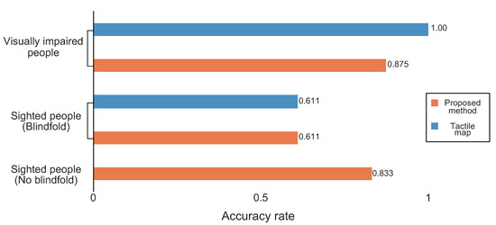 Accuracy rate: In the proposed method, the accuracy was almost the same between those without a blindfold and those with visual impairment. For the tactile map, the accuracy of the visually impaired subjects was 100%, which was different from that of the sighted subjects.